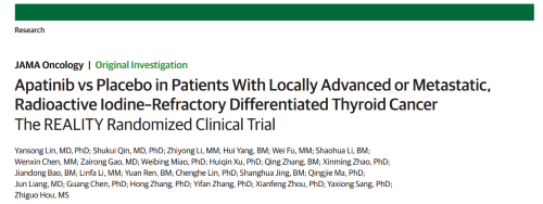 2021年12月16日,权威医学杂志《JAMA Oncology》(影响因子31.777)在线发表阿帕替尼的一项III期临床研究(REALITY)——甲磺酸阿帕替尼片治疗局部进展/转移性放射性碘难治性分化型甲状腺癌(RAIR-DTC)患者的多中心、随机、双盲、安慰剂对照临床研究。此研究由北京协和医院的林岩松教授和南京金陵医院的秦叔逵教授发起,在全国21个研究中心展开,由918博天堂医药中央医学事务部团队支持完成。